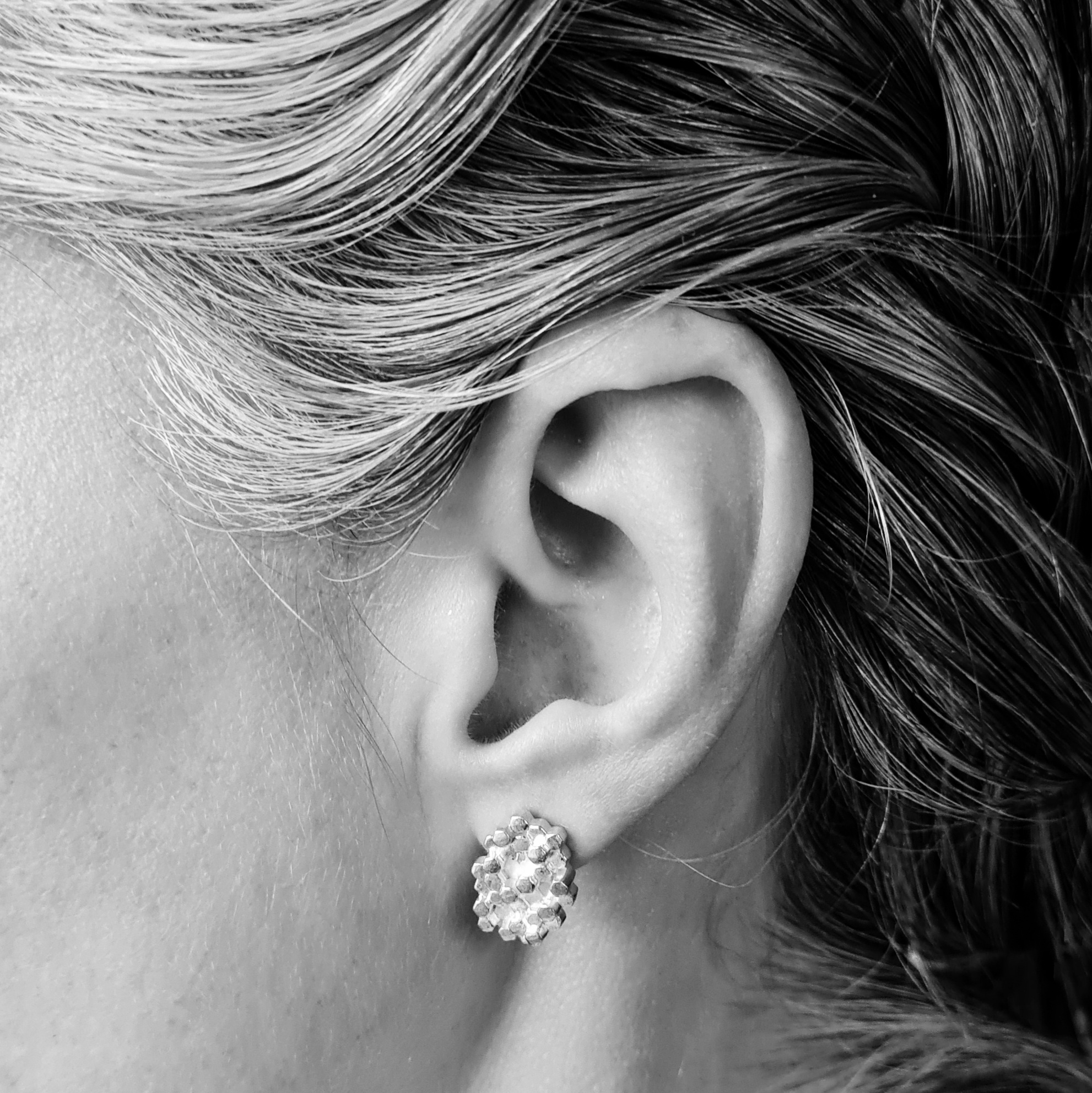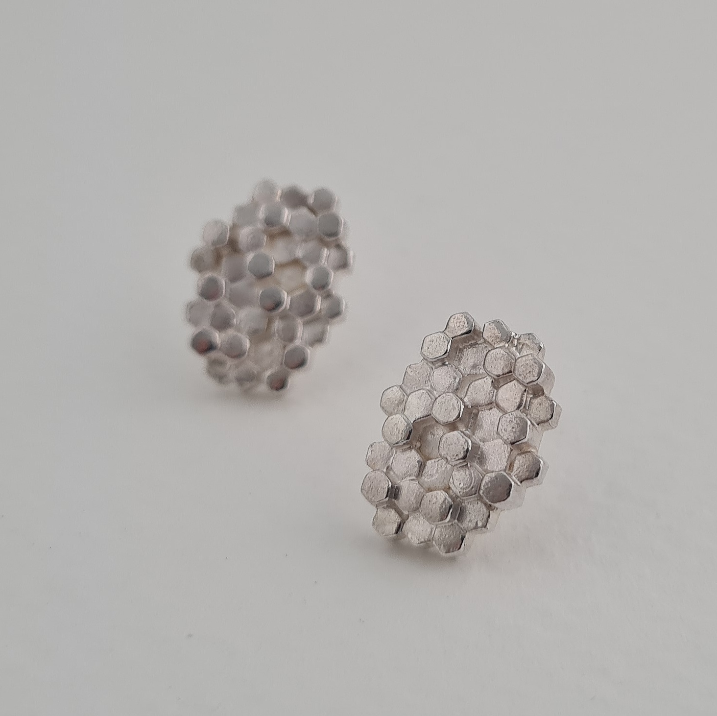 These earrings are based on the basalt rock structures of Staffa as seen from above. The design echoes the hexagonal columns of the island and depicts the sculptural forms found in the rock structures which were created when cooling flows of lava came into contact with the bedrock. The earrings come in luminous satin finish.